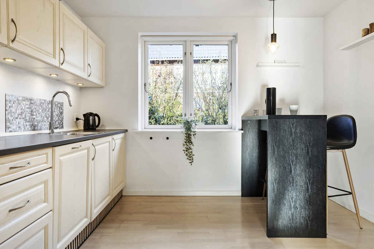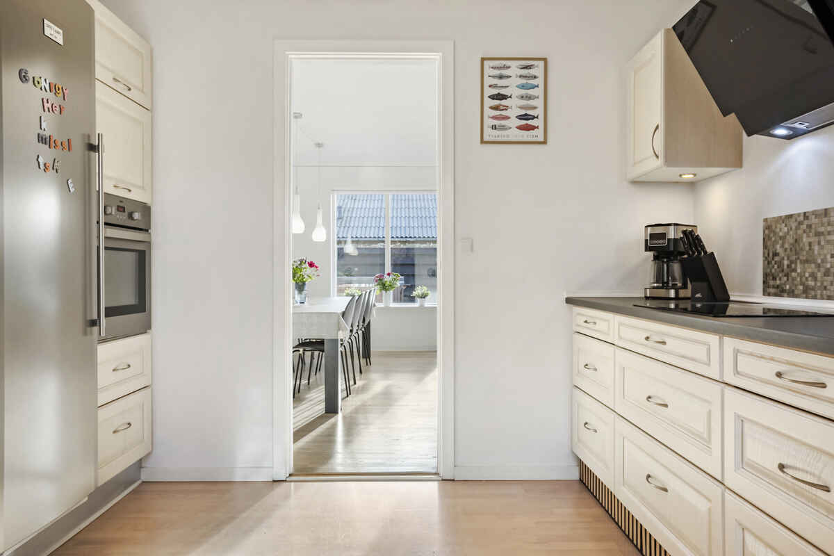 Kvalitetskøkkenet byder bl.a. på keramiske kogeplader, emhætte, separat varmluftovn med grill, mikrobølgeovn, opvaskemaskine, kaffemaskine, køleskab samt separat kummefryser på min. 100 liter.