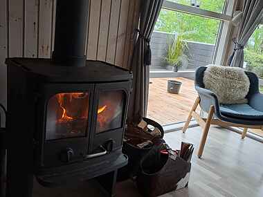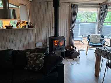 Stuen er indrettet med en hjørnesofa og spisebord med 8 stole og brændeovn.
