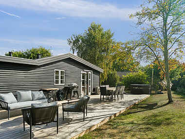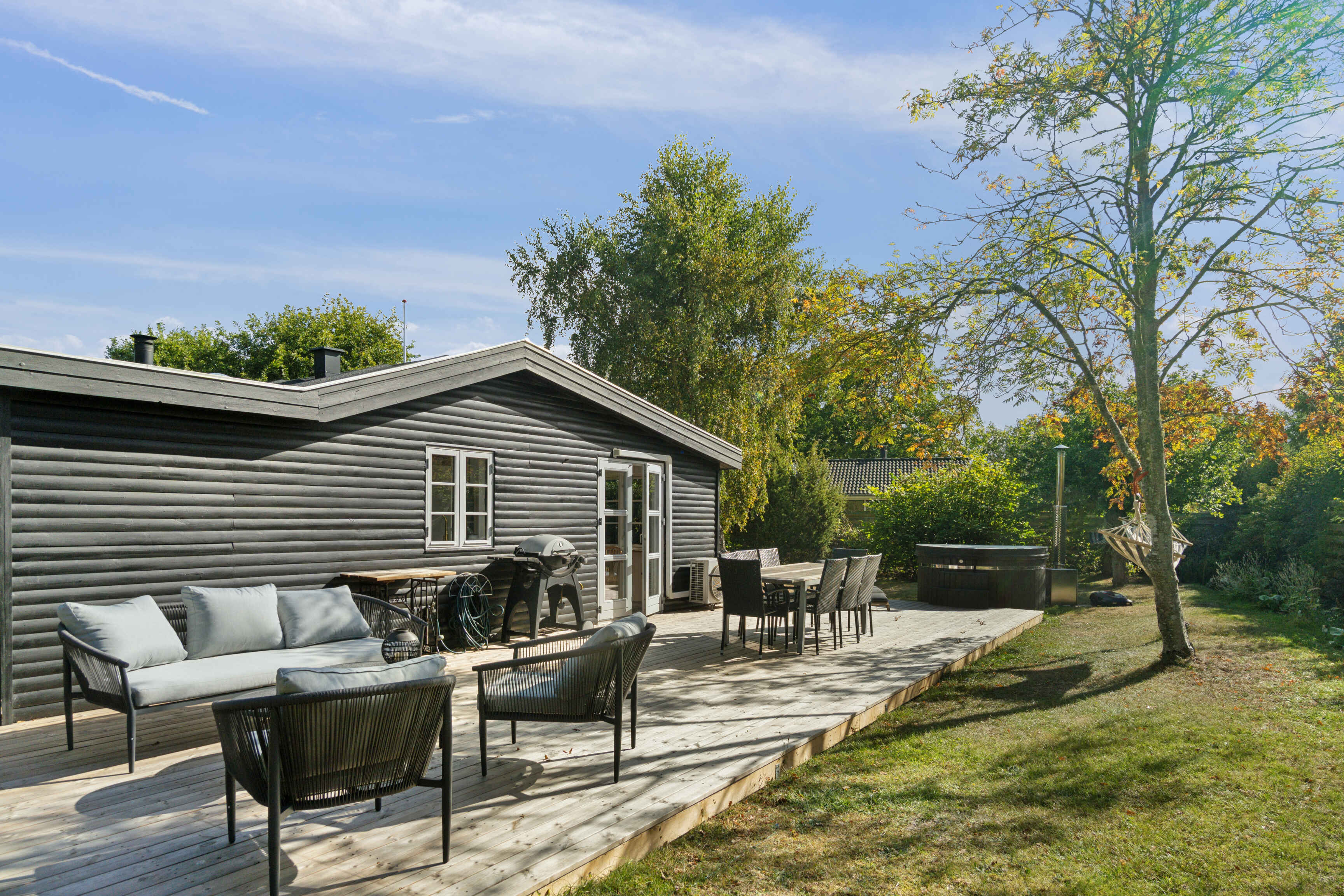 I huset samles I i det åbne fællesrum omkring køkken og spiseområde – perfekt til aftener med spil og måltider. Terrassen mod sydvest indbyder til grillaftener eller stille stunder under birketræet.
