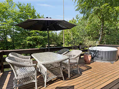 Rundt om huset finder du flere terrasser med markiser, terrassevarmere og lækre havemøbler. Uanset vindretning kan du finde læ og sol. Haven er anlagt med respekt for natur og biodiversitet og emmer af ro. Det grønne energiforbrug sikrer, at opholdet er bæredygtigt.