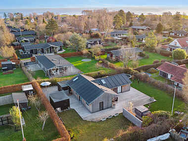 Den 180 m2 overdækkede træterrasse med solsejl er perfekt til udendørs samvær, mens det private, ugenerede grundområde skaber en afslappet og fredfyldt atmosfære.