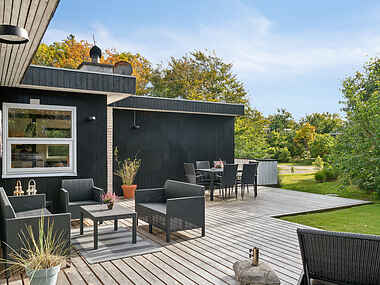 Udendørs kan I nyde solen på den rummelige træterrasse, udstyret med havemøbler og kulgrill. Grunden er på over 1000 m², hvilket giver plads til leg og afslapning i de grønne omgivelser.