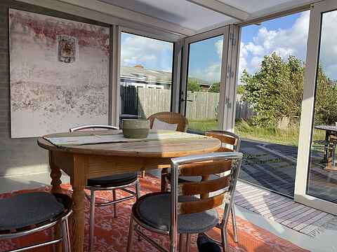 Stort charmerede sommerhus med gå afstand til den sikreste og bedste strand på vestkysten samt til byens mange spændene aktiviteter og spisesteder. Vi har gjort os umage med at gøre huset til et rart sted at være med kunst og keramik. Der er en lukket have mod sydvest med en stor træ terrasse, der giver mulighed for at værne om privat livet og i læ for vesten vinden. Efter en tur i vandet er det muligt at bruge udebruseren på terrassen. Vi elsker vores udestue, hvor der selv på en regnvejrsdag er varmt og hyggeligt.