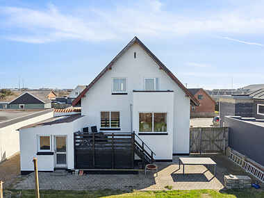 Dejligt hus beliggende 250 meter fra Vesterhavet og med kort afstand til såvel Sneglehuset som Wærket der er boldhal, legeplads og svømmehal i samme bygning. Lejerne i huset har gratis adgang til Wærket. Huset har 3 store soveværelser med King Size senge hvoraf 4 senge har elevation. Stort køkken med ALT i udstyr og i åben forbindelse med stuen. I stuen forefindes to lædersofaer samt 55 tommer fladskærmsTV. Badeværelset ligger på 1. sal sammen med de 2 værelser og indeholder foruden toilet også en bruseniche. fra stuen er der adgang til dejlig stor terrasse med udsigt til klitterne og solnedgangen. I kælderen forefindes blandt andet vaskehus med vaskemaskine og tørretumbler.