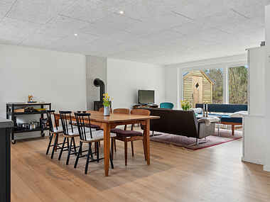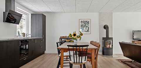 I det åbne køkken-alrum er der varmepumpe og brændeovn, der sikrer et behageligt indeklima året rundt. Her kan I samle jer til hyggelige måltider og afslapning.