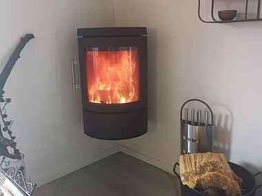 Køkkenet præsenterer sig flot med hvidt inventar og en halvmur, der delvist adskiller det fra opholdsstuen, hvor en brændeovn fra 2020 skaber varme og atmosfære. Herfra fører døre ud til en delvist overdækket sydvendt terrasse, der lokker med sin skønhed og beroligende udsigt.