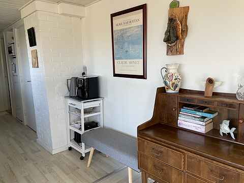 Indendørs byder huset på en rummelig opholdsstue med en elegant spiseafdeling, hvor store vinduespartier åbner op for lyset og naturens skiftende farver. Fra stuen er der direkte adgang til terrasserne og haven, hvilket skaber en sømløs forbindelse mellem indendørs og udendørs rum.