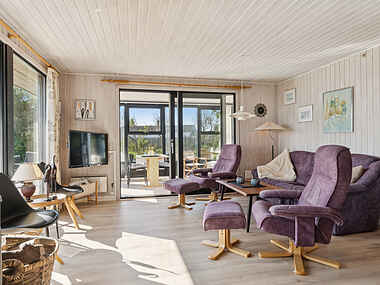 Fra den lyse udestue er der udsigt til Kattegat. Her kan du nyde morgenkaffen i ly for vinden, mens du ser solen stå op over vandet. Huset har flere terrasser, så du altid kan finde en solplet eller læ til grillmaden.