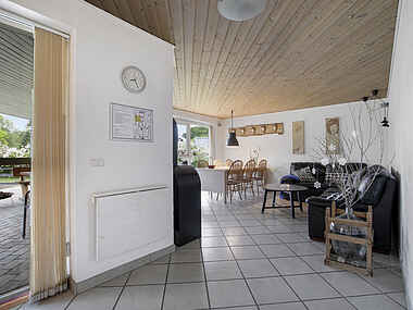 Huset fremtræder lyst og venligt med hvidmalede, vandskurede vægge. Her er brændeovn og gulvvarme overalt. Huset er moderne og velmøbleret med alt i inventar.
