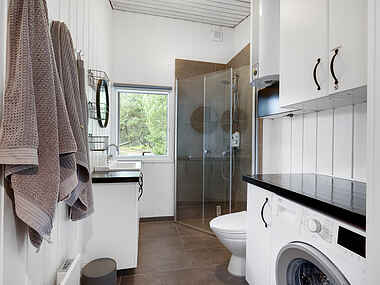 Sommerhuset har et fuldtudstyret køkken, samt nyere badeværelse med vaskemaskine.