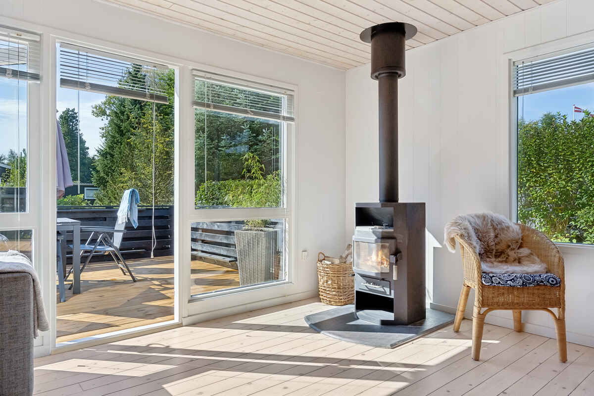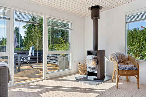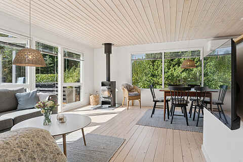 Huset er indrettet med varme og sjæl – en klassisk skandinavisk stil med lyse vægge og en hyggelig brændeovn, der skaber stemning på kølige aftener. Det er det perfekte fristed for både familier og par, som ønsker fred, komfort og nærhed til naturen.