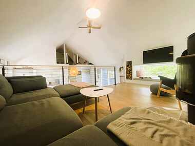 Køkken og stue er i forskudte plan, hvilket skaber en unik og hyggelig atmosfære. Det moderne køkken er fuldt udstyret med alt, hvad I behøver for en bekvem ferie. Den lyse indretning og de åbne rum skaber en afslappet stemning, og med både varmepumpe og brændeovn er huset behageligt året rundt. Der er naturligvis fri internetadgang, så I nemt kan holde forbindelsen – eller streame en film efter en dag i naturen.