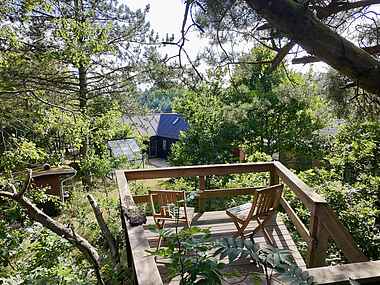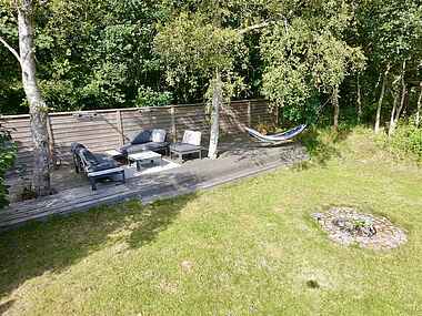 Udenfor byder haven på små, hyggelige kroge, hvor morgensolen kan nydes med en kop kaffe. Den store træterrasse med læhegn indbyder til lange sommerdage under åben himmel. Her kan I forkæle jer selv med et vildmarksbad, skylle sandet af under den udendørs bruser eller samle familien omkring bålet, når aftenen falder på.