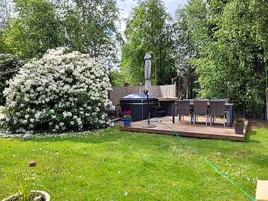 Udendørsområdet er en drøm i sig selv, med den frodige, indhegnede have. Nyd et stort overdækket vildmarksbad drevet af brænde, en dejlig terrasse og endda en praktisk udendørs bruser om sommeren . Med en stor gasgrill og tilhørende gasflaske til låns, er udendørs madlavning en leg. Børnene vil elske trampolinen, gyngerne og sandkassen, samt en række udendørs legetøj, der garanterer smil og latter.