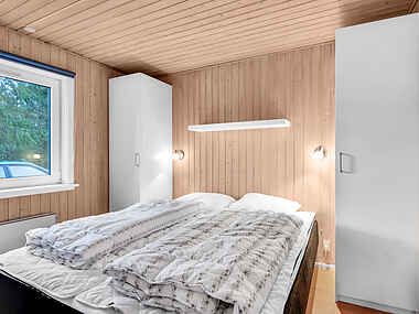 Men sommerhuset byder ikke kun på indendørs fornøjelse. Det har også en træterrasse, der omslutter huset mod både syd og vest. Her kan du nyde lange, solrige dage, sidde komfortabelt i havemøblerne og måske tage en lur i de bløde solsenge.