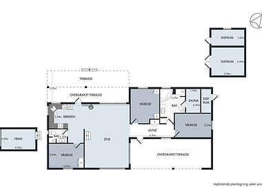 Udendørs byder en stor terrasse med overdækning på afslapning. Havemøbler på begge terrasser inviterer til både morgenkaffe og aftensmad i det fri. Haven er oplagt til børnefamilier, da det er en lukket have med gynger, legehus og et shelter.