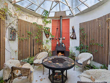 Indenfor i hovedhuset finder I en tunnelpejs, som elegant forbinder stuen med soveværelset og skaber en hyggelig atmosfære. Der er også en brændeovn i atelierbygningen; lejer skal dog selv sørge for brænde til begge ovne.