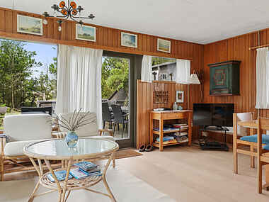 Dette sommerhus er et oplagt valg til en afslappende ferie tæt på natur og strand. Huset er omkranset af træer og ligger helt ugenert på en naturgrund med god plads til udendørs leg og ophold. I finder masser af lækroge på grunden, hvor man kan læse, slikke sol eller spise alt efter vejr og vind.