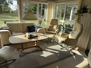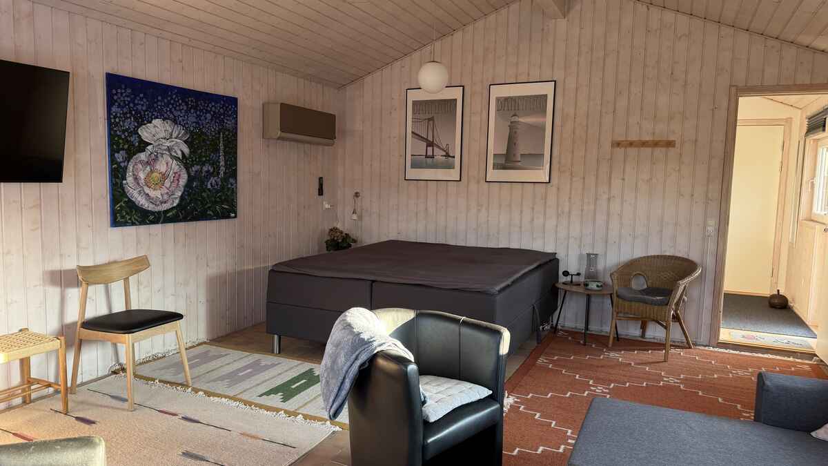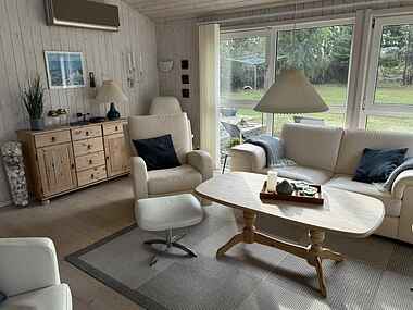 Huset er i enden af privat og lukket vej , og rummer tre soveværelser med dobbeltsenge og en sovesofa, hvilket giver i alt otte sovepladser. Her er god plads til både store og små feriegæster.