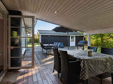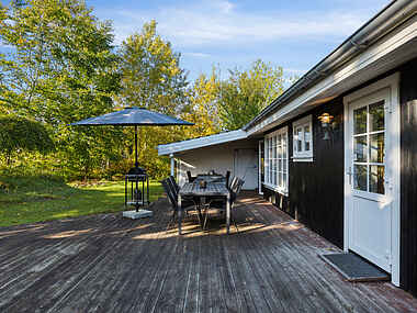 Huset på 131 m² byder på fire soveværelser og otte sovepladser, ideelt til familier eller grupper (et af soverummene findes i anneks). Der er også flere terrasser, hvor I kan nyde det danske sommervejr.