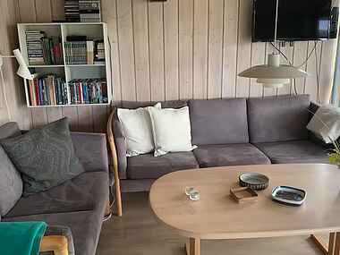 Indenfor byder huset på en lys og indbydende stue i åben forbindelse med et funktionelt og veludstyret køkken, hvilket skaber gode rammer for fælles hygge og samvær. Her er i alt seks sovepladser fordelt på tre soveværelser: to værelser med køjesenge og ét værelse med to enkeltsenge – perfekt til både børn og voksne.