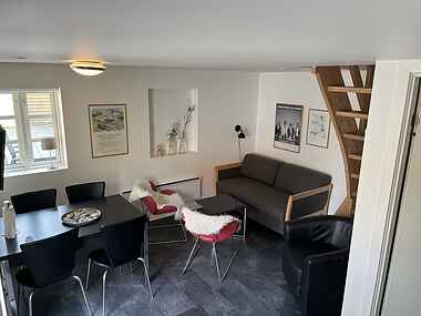 Indgangen fører direkte til en hyggelig stue med te-køkken, miniovn og kogeplader. En trappe fører op til første sal, hvor der er to soverum med dobbeltsenge (1 x 120 cm. x 200 cm og 1 x 120 cm og 130 cm). Alt er funktionelt og praktisk indrettet.