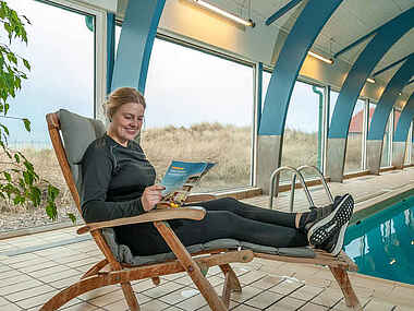 Her er den oplagte mulighed for aktiv ferie med blandt andet: Opvarmet pool med udsigt over klitter og hav, spa, sauna, fitnessrum, bordtennis, billard og legerum til de yngste.