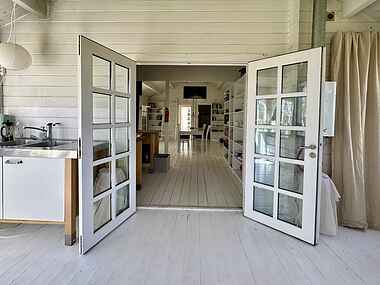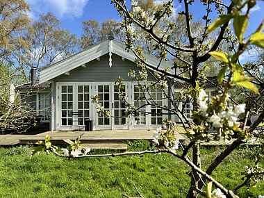 Villaen er et klassisk sommerhus med en spisestue, en tv-stue , et atelier og terrassestue. Her kan man nyde morgenkaffen i den solrige udestue, der åbner ud til en stor terrasse med dels to solstole og et stort spisebordsarrangement med plads til ti gæster. Man kan også slå fødderne op i TV-stuen eller hygge sig med bordfodbold, dart og bobspil i terrassestuen.