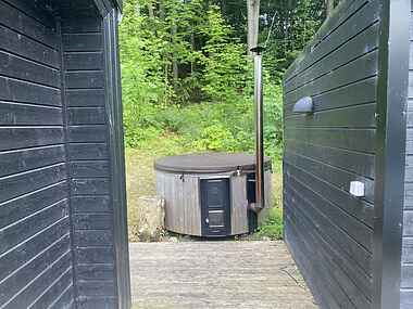 Udenfor finder I en udendørs pool som er opvarmet fra maj til oktober (26-28 grader), et vildmarksbad og shelter, der giver mulighed for naturoplevelser og afslapning under åben himmel. Gratis brænde er inkluderet, så hyggen er altid sikret.