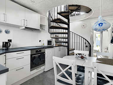 Gennem stuen på første sal åbner sig en dør ud til en skøn terrasse, udstyret med en charmerende cafébord og stole. Lad jer forføre af øjeblikkets fred og skønhed, mens I nyder en forfriskende sodavand eller en velsmagende kop kaffe og beundrer havudsigten.