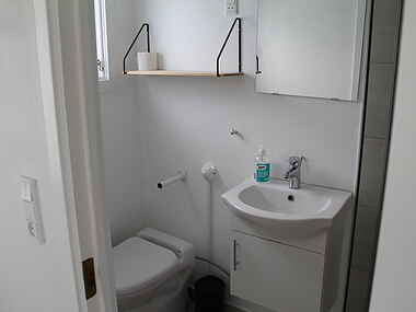 Dertil badeværelse, med toilet, bruser samt håndvask.