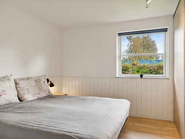 De tre soveværelser har dobbeltsenge, som kan opdeles, hvilket giver fleksible overnatningsmuligheder. Derudover er der en stor hems på 24 m2, der indbyder til hygge og leg.
