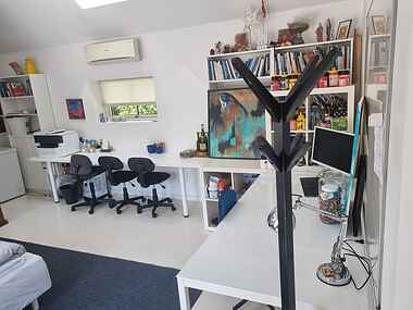 Huset har en stor åben stue med køkken, spiseplads og sofaområde med læsehjørne. Der er et stort soveværelse kombineret med skriveborde/hobbyplads. Derudover 2 mindre soveværelser. 6 sovepladser i alt. Hemsen er lukket af og kan ikke benyttes.