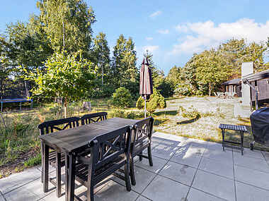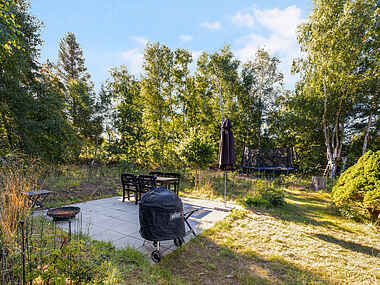 Terrassen er hele 55 m2 og der er både sol og skygge på den i løbet af dagen efter ens behov. Der er desuden en fliseplads på grunden, placeret hvor aftensolen er og hvor der er grill og spisebord.