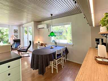 Sommerhuset består af en hovedbygning med et soveværelse og bad, med to store terrasser (en overdækket). Derudover er der to hytter med et soveværelse hver. Der er i alt tre dobbeltsenge (nye 2025)(king, queen, queen) og en køjeseng. Så man kan komfortabelt være 8, incl. 2 er børn der vil sove i køjeseng.