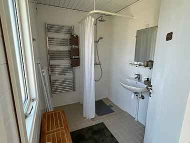Hertil er der et godt badeværelse med ny sanitet, håndklædetørrer, bruser og badeforhæng.