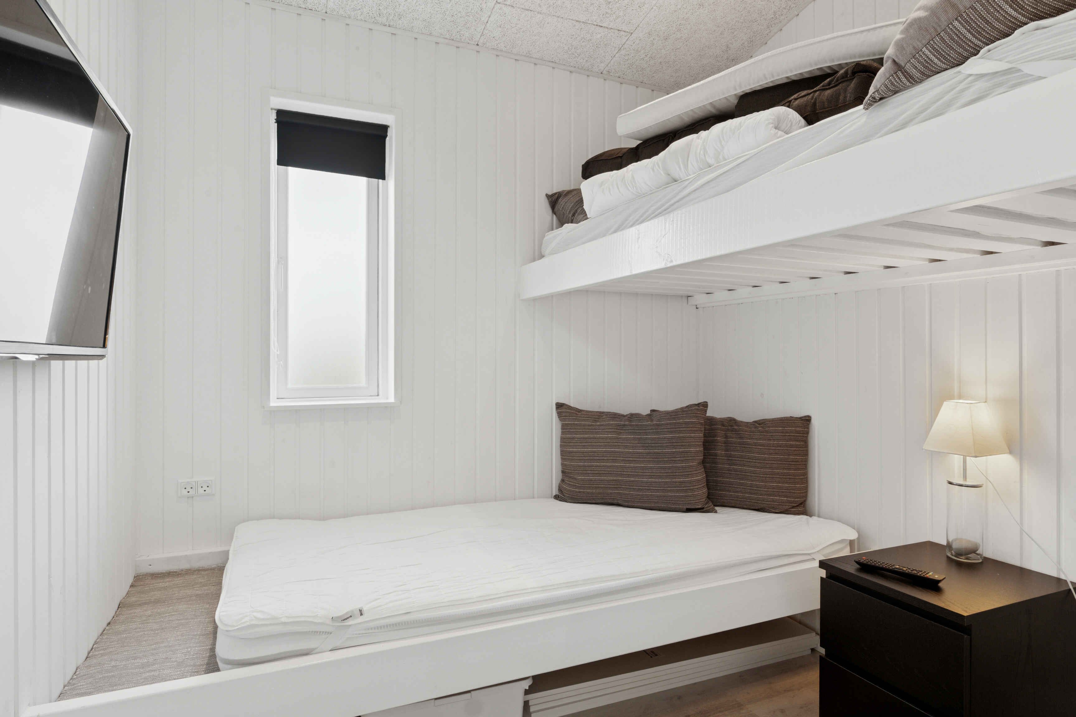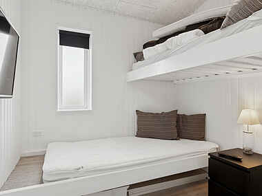 Dette sommerhus på 61 m² er indrettet med tre soveværelser og seks sovepladser. Huset fremstår lyst og venligt med en funktionel planløsning, hvor køkken og stue hænger naturligt sammen. Fra stuen er der udgang til en terrasse med udsigt over vandet, hvor måltider kan nydes i det fri.