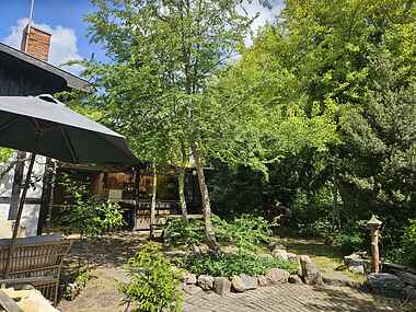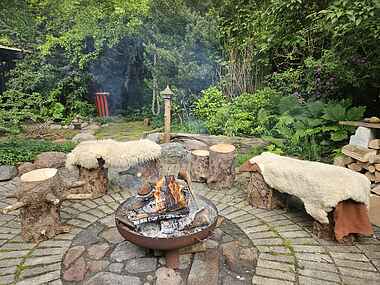 Udenfor finder I den store spændende have hvor børnene kan gå på eventyr i lysthuset i ’skoven’, og de voksne kan finde et ugeneret sted at nyde en kop kaffe. Der er også en dejlig terrasse, perfekt til grillmiddage. Der findes riste til på grill over bål, og der er også grill i udekøkkenet under overdække.