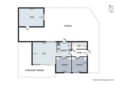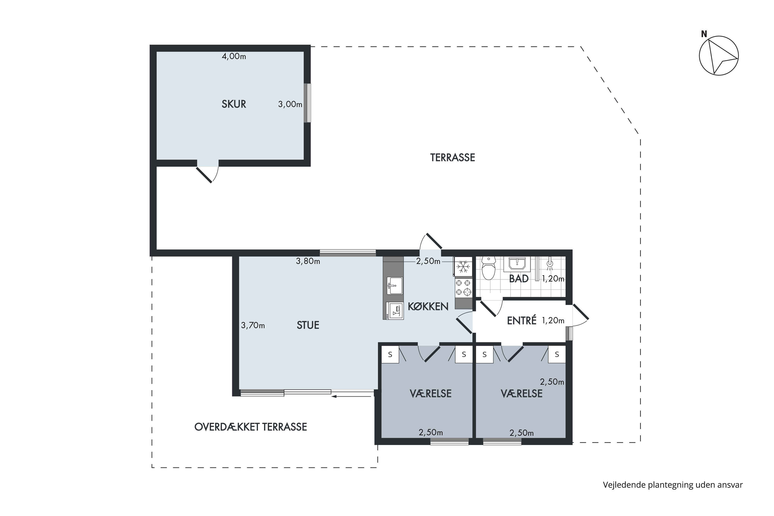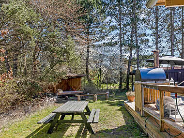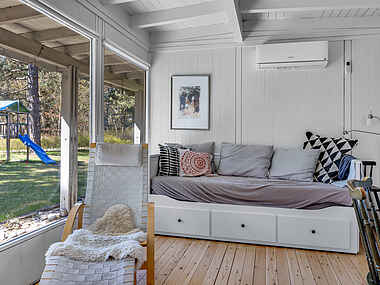Dette skønne sommerhus er indrettet med to separate soveværelser og yderligere overnatningsplads i stuen på en komfortabel sovesofa, hvilket gør det ideelt til op til 4 personer. Uanset vejret har du mulighed for at nyde udendørslivet takket være den overdækkede terrasse samt den private oase på bagsiden af huset. Her venter en rummelig træterrasse, et hyggeligt bålsted og et charmerende shelter, der inviterer til både samvær og afslapning. Sengene i værelserne er enkeltmandssenge, hvor den ene er i halv højde, tilføjer en sjov og unik dimension.