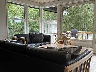 • Stor stue med spiseplads til 8 personer, hyggelig brændeovn og to komfortable sofaer.