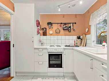 Huset er indrettet i retro stil: Hyggelig stue med lille brændeovn og udgang til til overdækket terrasse, hvor man kan sidde og nyde naturens fred, også når det regner. Fra det lille køkken er der adgang til stuen samt spisestue, adskilt med franske døre. Toilet og bruser er i 2 forskellige rum. Bag huset er der lille græsplæne, som er omkranset af træer og buske, så helt privat og på terrassen kan I slappe af i havemøblerne, tænde op for grillen og blot nyde sommeraftenerne i rolige omgivelser.