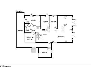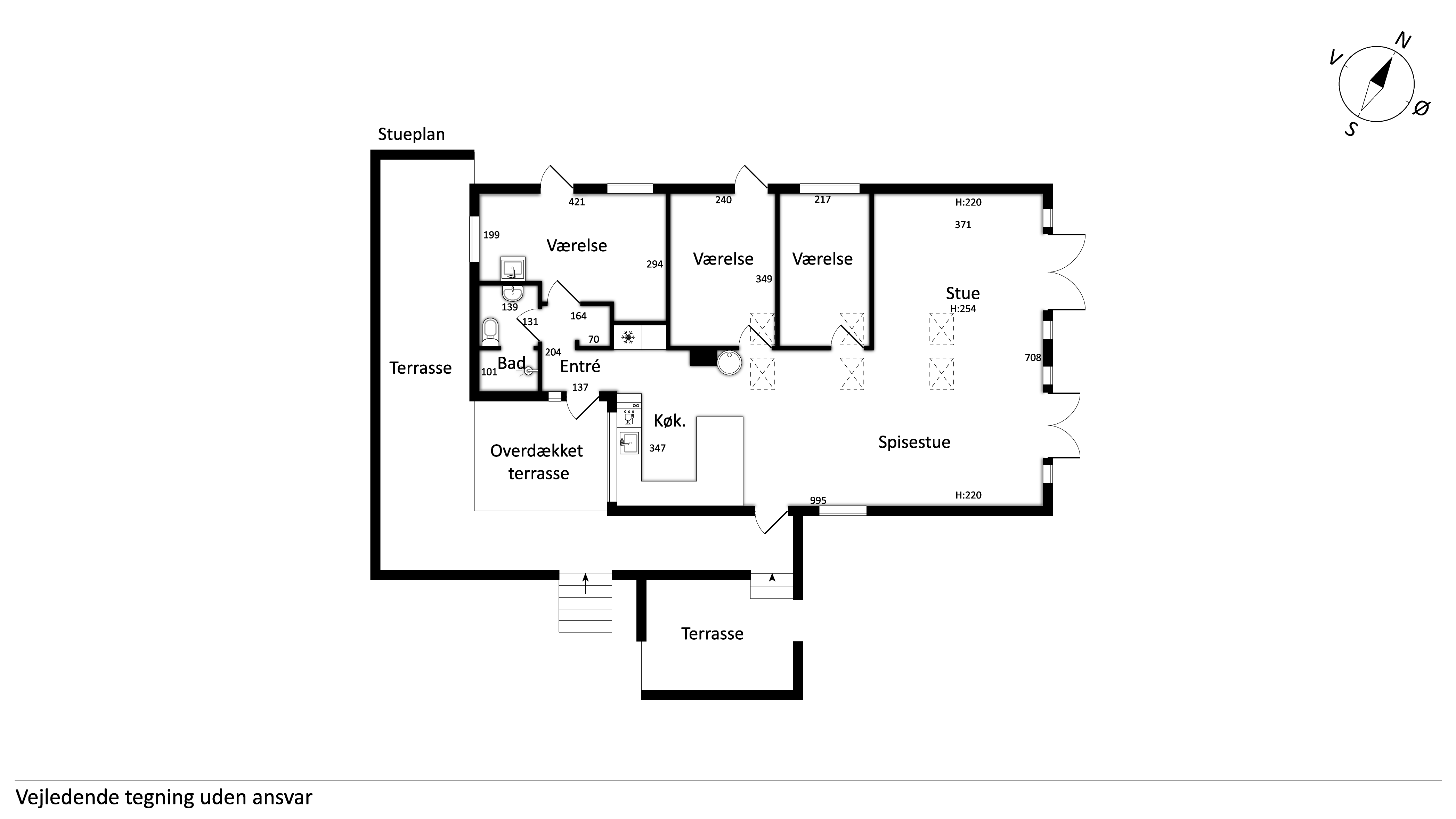 Det store vinduesparti og ovenlysvinduerne skaber en lys og luftig atmosfære i hele huset. Her kan I nyde udsigten til haven og kigget til fjorden fra stue, spisestue og køkken.