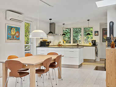 Det store vinduesparti og ovenlysvinduerne skaber en lys og luftig atmosfære i hele huset. Her kan I nyde udsigten til haven og kigget til fjorden fra stue, spisestue og køkken.