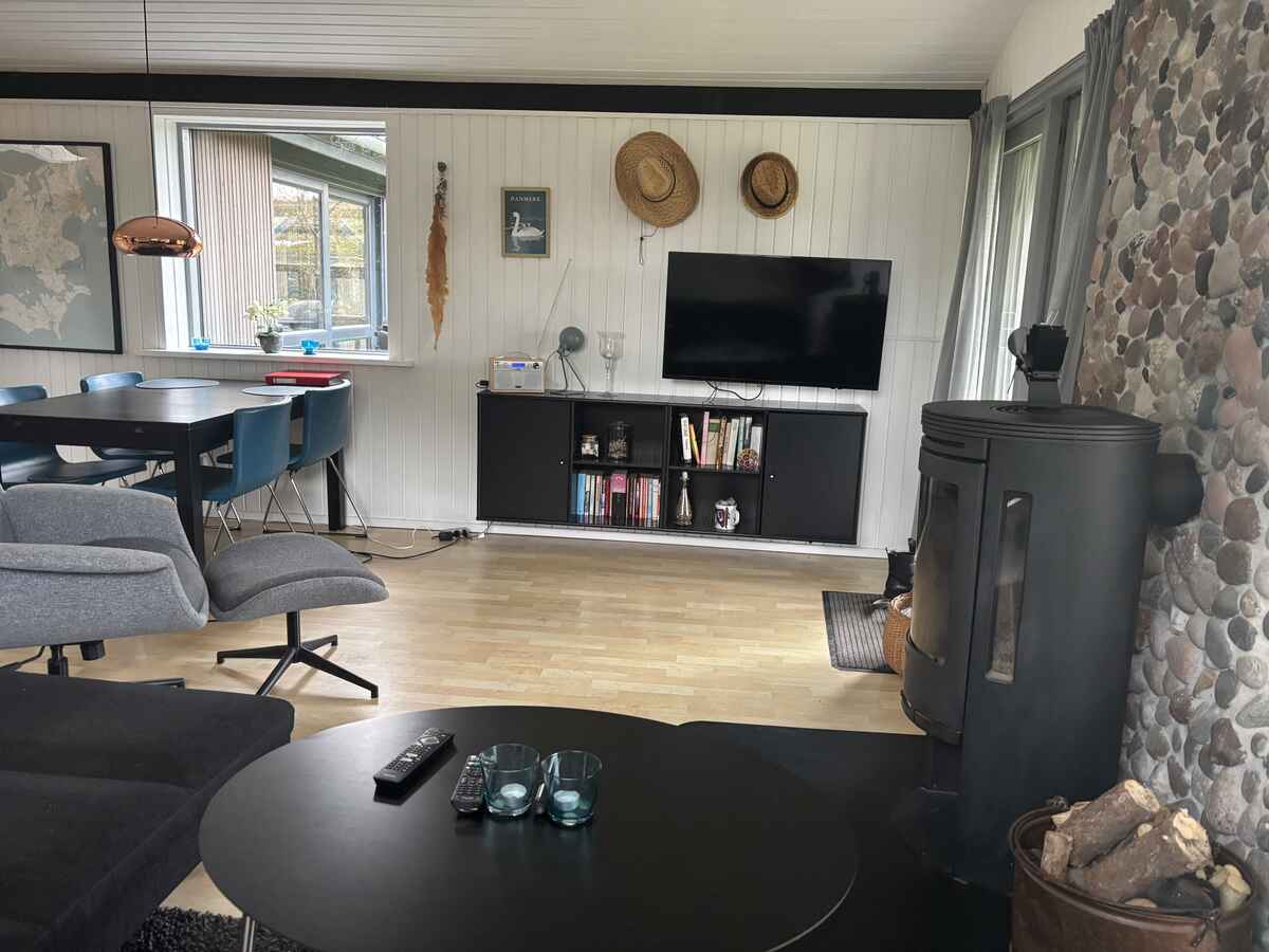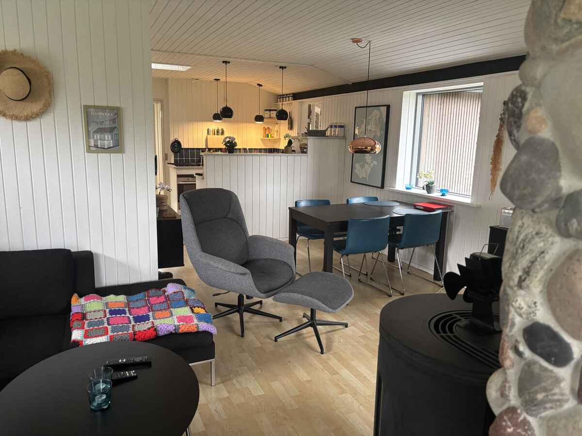 Huset har 3 soveværelser og kan rumme op til 6 personer fordelt på 3 enkeltsenge, 1 køjeseng og 1 dobbeltseng. Derudover er der et dejligt badeværelse, et funktionelt køkken og en hyggelig stue med brændeovn, hvor man kan slappe af efter en dag fyldt med aktiviteter. Huset er hyggeligt indrettet med fokus på det funktionelle og uden at det bliver for fint.