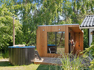 I tilknytning til terrassen er der vildmarksbad, sauna og udendørsbruser, der ligger uforstyrret og indbyder til ro, stilhed og velvære – uanset årstiden.