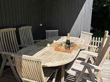 Udenfor finder I en stor, overdækket terrasse, der forlænger sommeraftenerne med lys, varme og samvær – uanset vejret. Haven er stor og helt privat med græsplæne til leg og solbadning, hængekøje og hængestole, samt en bålplads, hvor I kan riste skumfiduser under stjernerne.