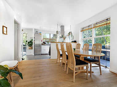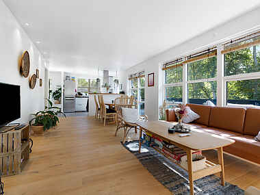 Huset fremstår indbydende og lyst med dejlige vinduespartier med skønt lysindfald.