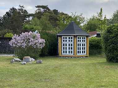 Der er en dejlig træterrasse med sol det meste af dagen samt et overdækket område, hvor udelivet kan nydes på trods af lidt regn eller lavere temperaturer. Grunden er 1200 M2 med masser af hyggekroge og plads til udfoldelse. Der er vildmarksbad, gynger, trampolin, lysthus, bålplads og forskellige ude-spil. I kan ofte se rådyr og harer løbe over grunden i de tidlige morgen eller aften timer.