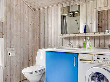 Badeværelset er beliggende „bagved‟ køkkenet, hvor I også finder en mindre garderobe for eventuelt overtøj.