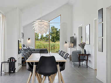 Dette eksklusive, arkitekttegnede sommerhus ligger helt ned til en fredelig sø i det attraktive Kongsnæsparken. Her får du en stor, solrig terrasse med smuk udsigt over vandet – det perfekte sted til morgenkaffen eller aftensolen.